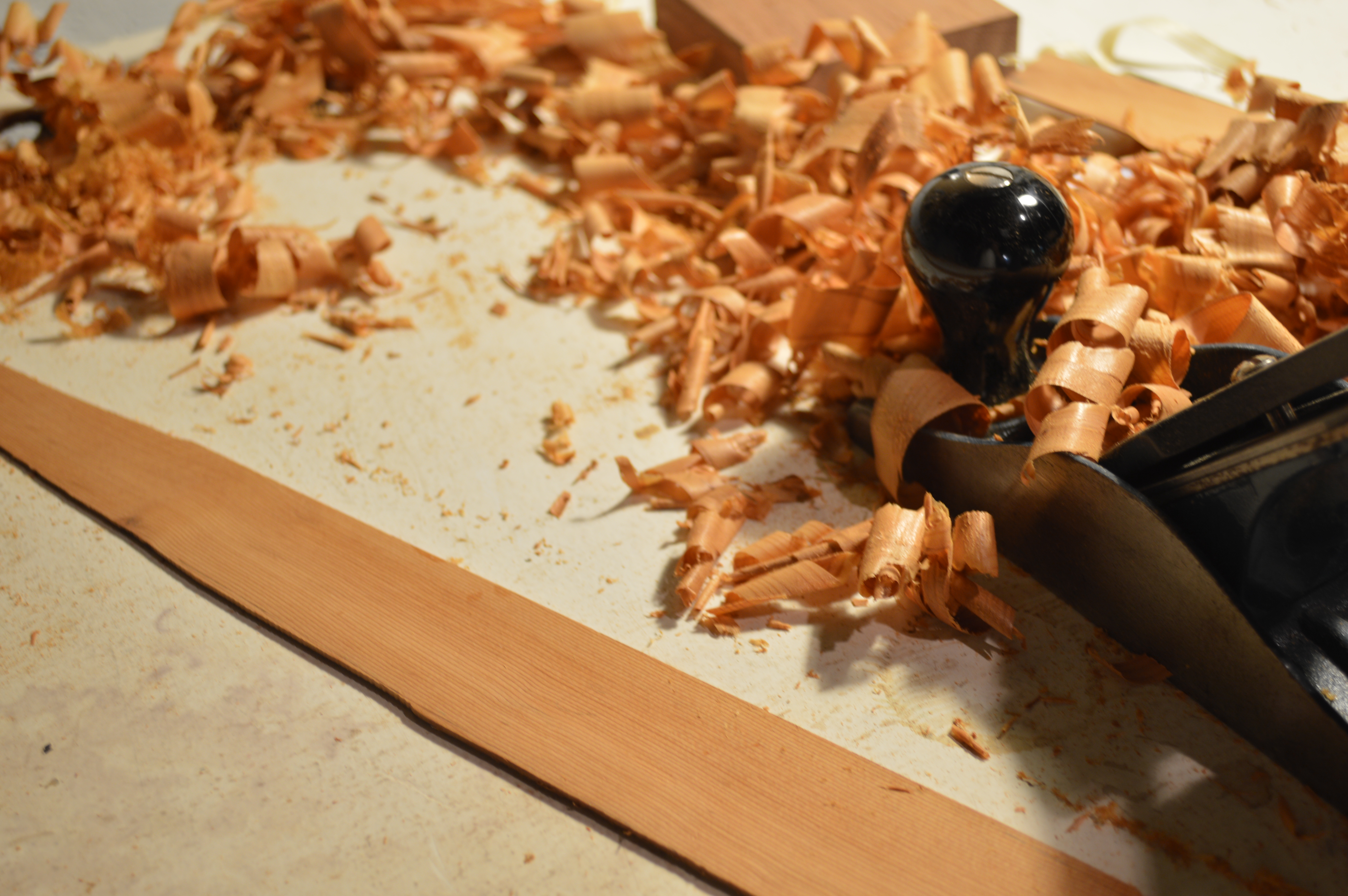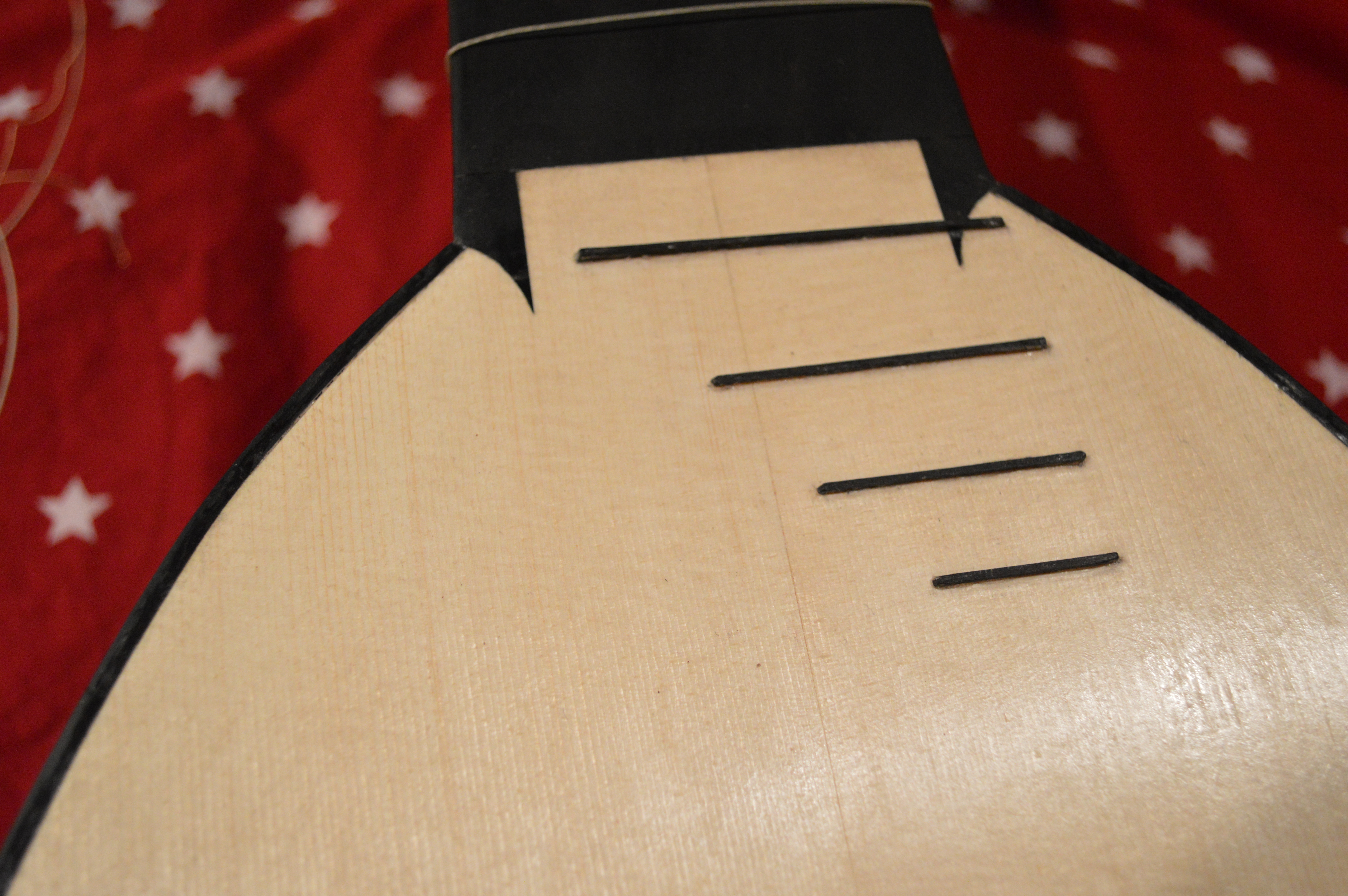 I measured out the placement for the 9th through 12th frets on the belly of the lute. These are made from ebony and planed down to about 1 mm thickness. First they are glued on and then I applied a few coats of wax for protection on the spruce belly. It is tricky to keep the spruce clean from any ebony dust contamination. A sharp scraper helps to keep dust to a minimum.