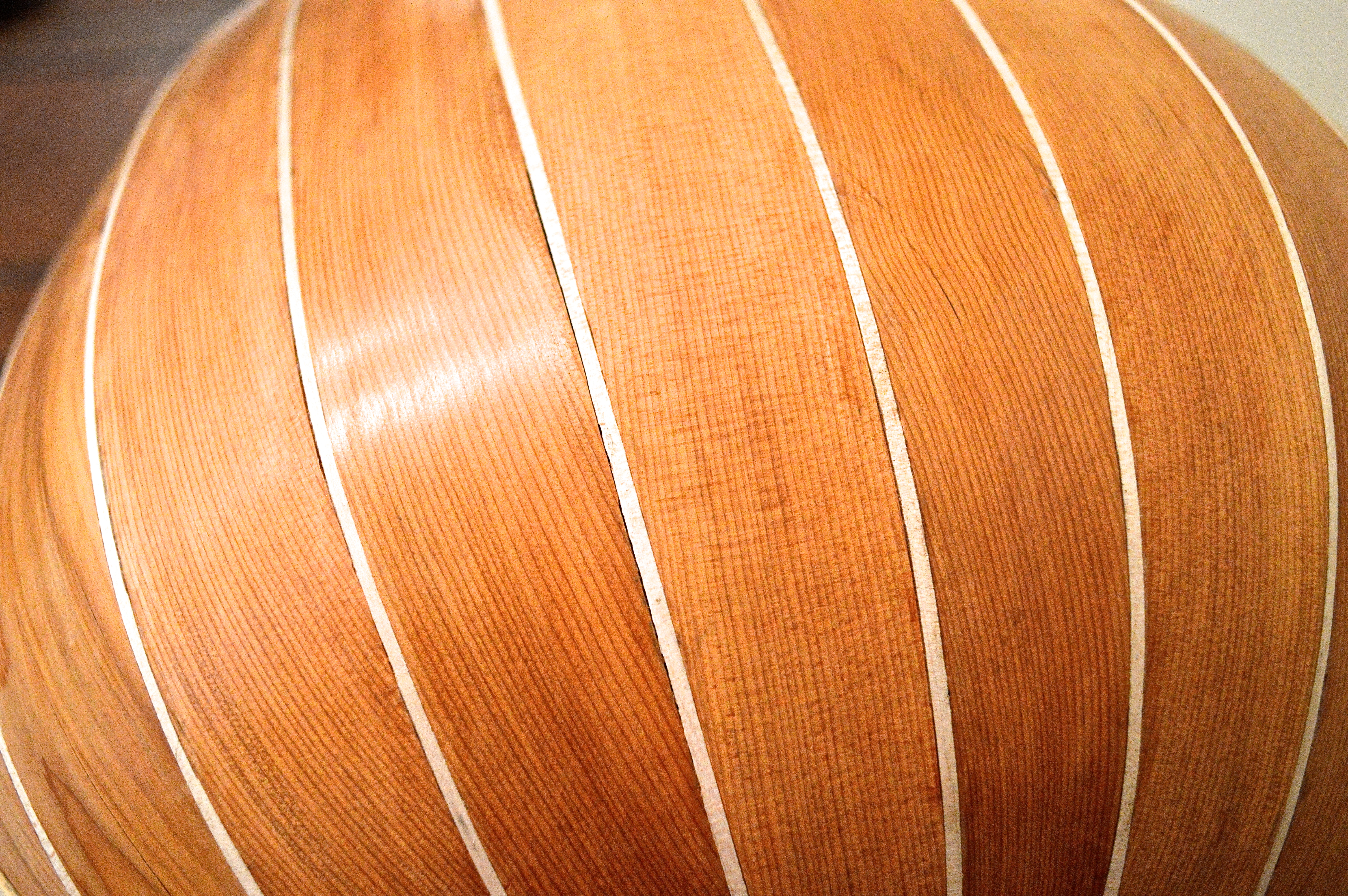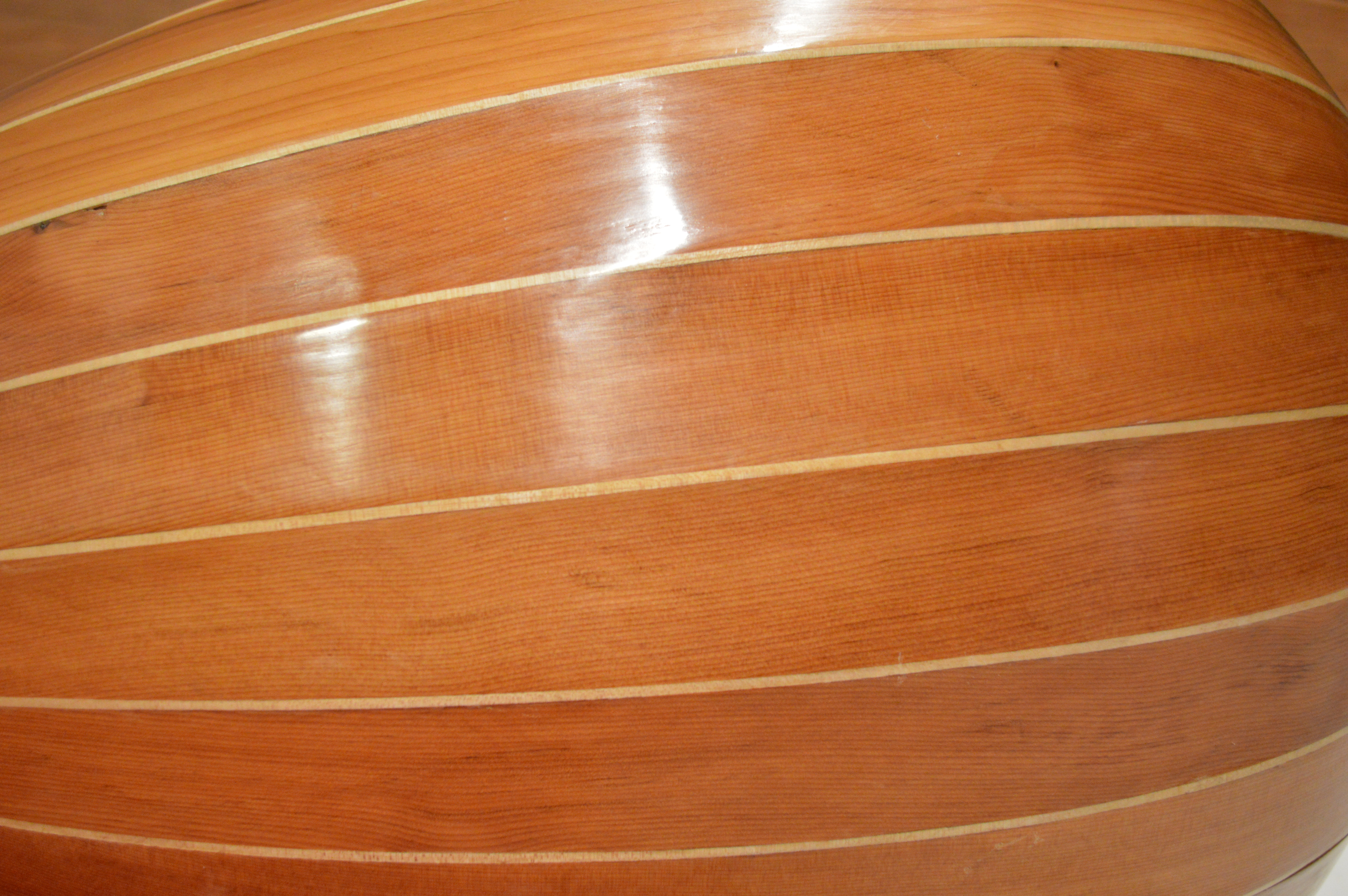 I have begun to prepare the bowl for varnishing. After scraping all the residual hide glue from joining the ribs, any irregular areas are sanded smooth. I burnish the wood with a very hard and smooth stone before applying any varnish. I show an example of what a burnished vs. non burnished rib looks like in the photo. The wood is pacific yew and it is very dense. It burnishes to a nice luster pretty quick.